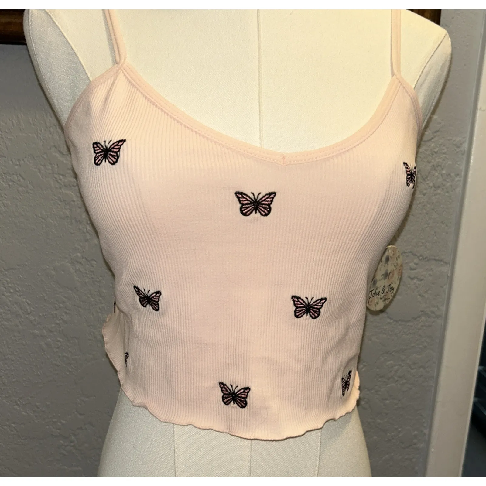 Dive into the vibrant essence of style with the Jolie & Joy crop top, a perfect blend of comfort and style. Adorned with delicate butterfly embroidery, this pink knit tank top in size L captures a whimsical yet contemporary aesthetic. Designed to flatter with an athletic fit and adjustable spaghetti straps, it's a charming choice for any casual outing, cocktail party, or while you're enjoying the beach vibes. Crafted from a soft mix of nylon and spandex, Its V-neckline adds a touch of allure to the overall casual look. Whether you're embodying the bohemian spirit or having a funky casual day out. Chest 30" stretchy Length 9" from pit Y2K, Baby doll, Fairy, Party Girl, Boho, Cottage Core, Summer,