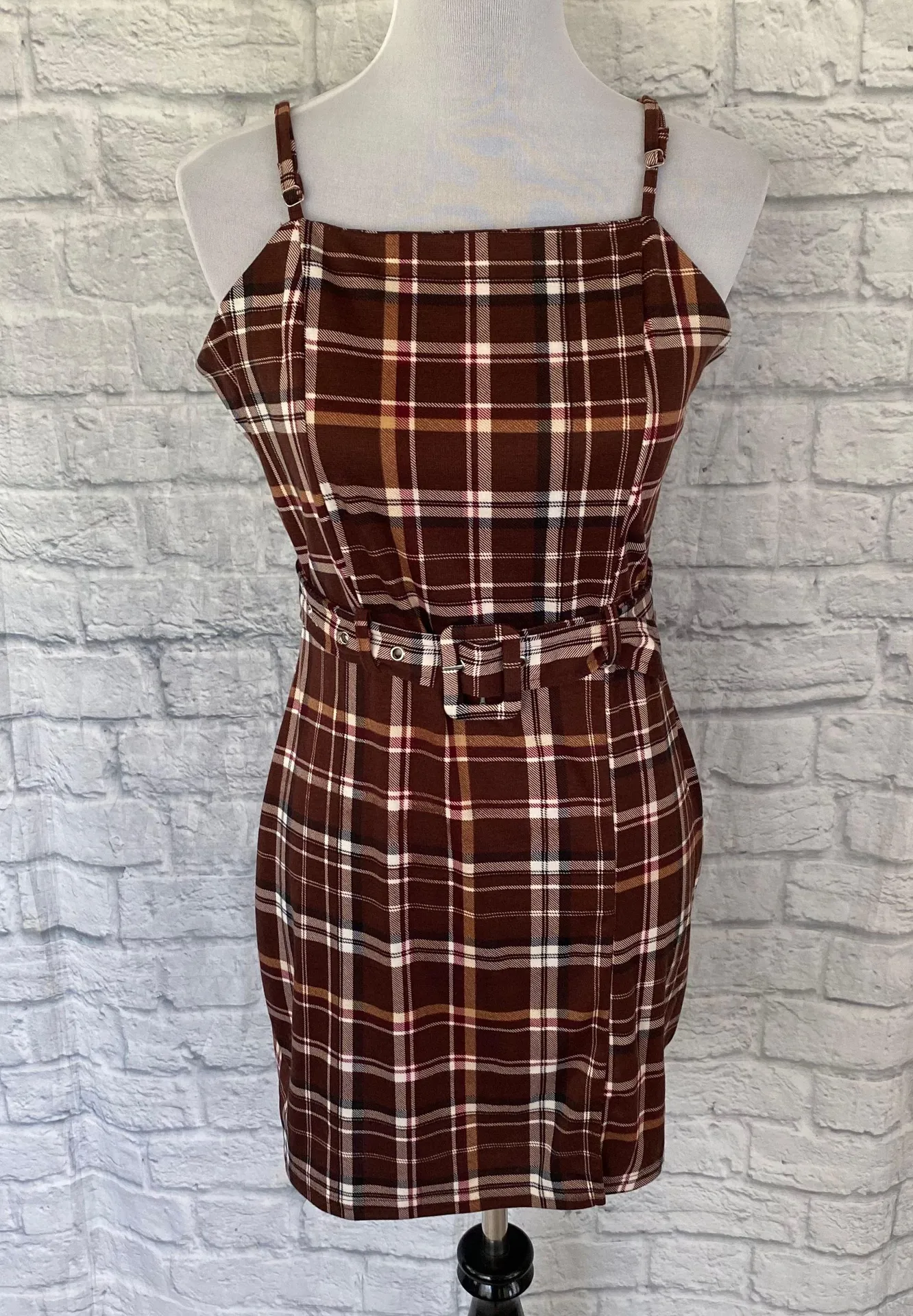 Jolie & Joy by FCT with Love women L brown plaid bodycon spaghetti strap dress Belt with buckle Belt loops Adjustable straps Front slit Pit to pit approx 17” Length approx 27”