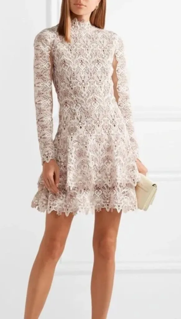 Jonathan Simkhai Natural Tulle-paneled Guipure Lace Mini Dress in Nude Combo; brand new An elegant off-white mini dress crafted from intricate guipure lace, featuring long sleeves and a tailored fit that exudes timeless sophistication and modern romance. Color: Off-White with nude pink accents High neck Long sleeve with lace detailing and sheer tulle Mini length Fitted bodice with a subtly flared or A-line Intricate guipure lace overlay Hidden back zip Scalloped lace edges Lined MSRP: $895 Approximate measurements: Chest: 36" Length: 35" *This item will be tagged with a security ribbon and unique ID number to prevent fraudulent returns. It can easily be removed with scissors. Once the ribbon is removed, the item will no longer be in the same condition as it was sent. Additional photos and video of packaging process may be taken prior to shipment. Tags: ladylike elegance, romantic minimalism, bridal ready, vintage revival, modern femininity, delicate textures, monochrome chic, summer whites trend, refined romantic, understated glamour, cocktail, wedding guest, bridal, engagement, elopement, Bridgerton, Sabrina Carpenter, dreamy, feminine, delicate, ethereal, charming, sophisticated