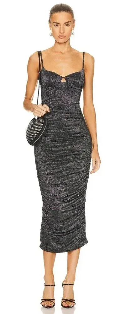 The Cristiana Metallic Jersey Midi Dress in Black. Form-conscious silhouette rendered in soft stretch metallic jersey. Strategic ruching and underwire cups flatter and enhance natural curves for a pared back sensuality. Pull-on styling Unpadded underwire cups with back clasp closure Adjustable shoulder straps Stretch jersey with ruched sides and lurex throughout Fully lined Hand wash 64% polyester, 17% rayon, 15% lurex, 4% spandex Made in China Our Style No. JDAF-WD76 Manufacturer Style No. 622-1042-ST Color: Black MSRP: $325.00 Features: • Totally Sold out on FWRD! Size: Womens XS Measurements taken flat across, Bust 13 in Hips 12 in Length 44 in Waist 10 in Condition: New With FWRD partial tag Tags: disco, night out, party, event, date night, sexy, bodycon, graduation, mini, cocktail, going out, bright colorful, fancy, wedding guest, sheath, brunch, bachelorette, simone, rush, sorority, designer, luxury, high end, runway, glitter, shimmer, metallic