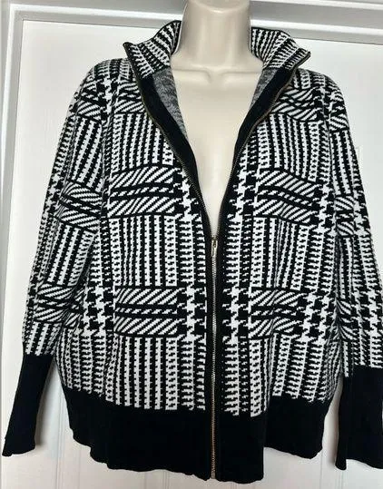 Jones New York Black & White Full Zip Classic Long Sleeve Houndstooth Sweater •Size Large, pit to p... Show more