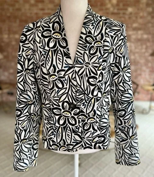 Jones New York Stretch Floral Blazer ~A pretty floral daisy print blazer with touches of blue and y... Show more