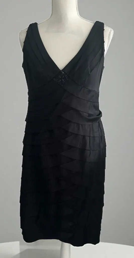 Elegant black cocktail dress with layered design, perfect for special occasions. Flattering silhouet... Show more
