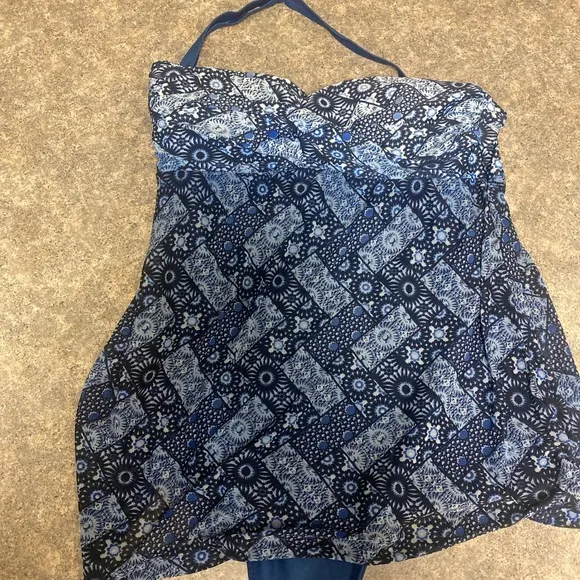 Dive into elegance with this Jones New York one-piece swimsuit, showcasing a striking blue and white geometric pattern. The strapless design features a sophisticated ruched effect, offering both style and comfort. Ideal for poolside lounging or a day at the beach.