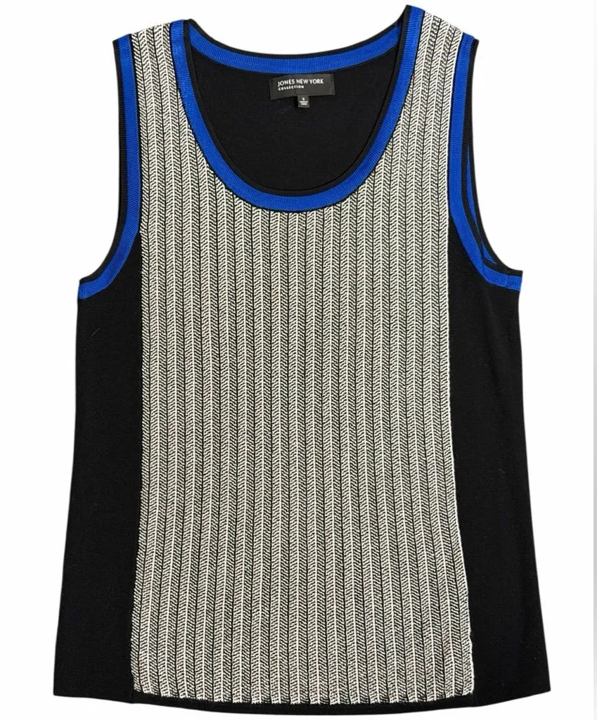Jones New York Collection sleeveless knit tank top featuring a modern black, white, and cobalt blue... Show more
