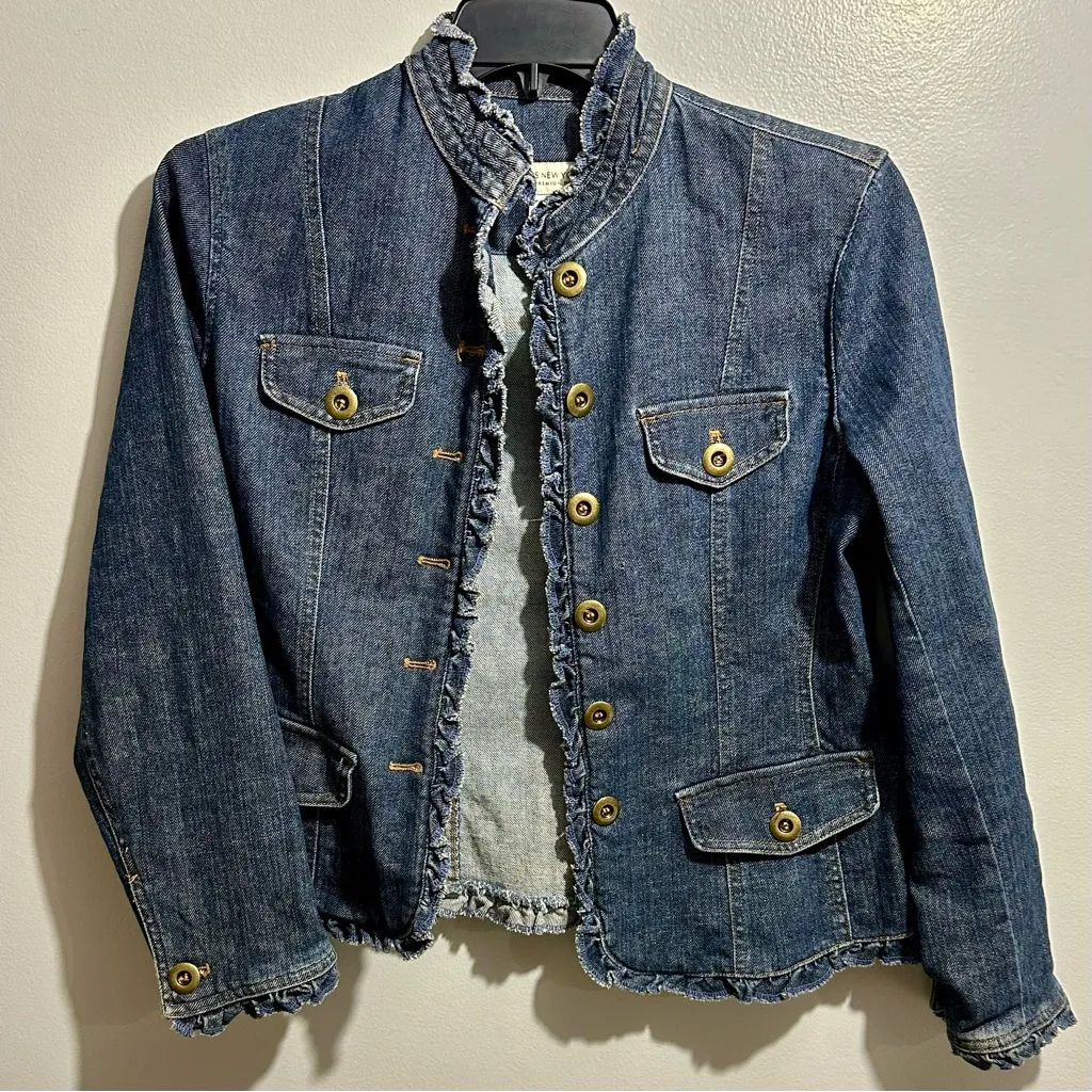 Elegant dark blue denim jacket with gold button details. Features a ruffled collar and pocket flaps.