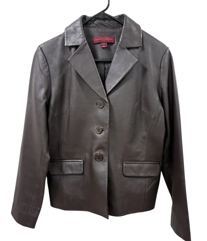 Chic dark brown leather jacket by Margaret Godfrey Features a classic button-up design. Ideal for ve... Show more