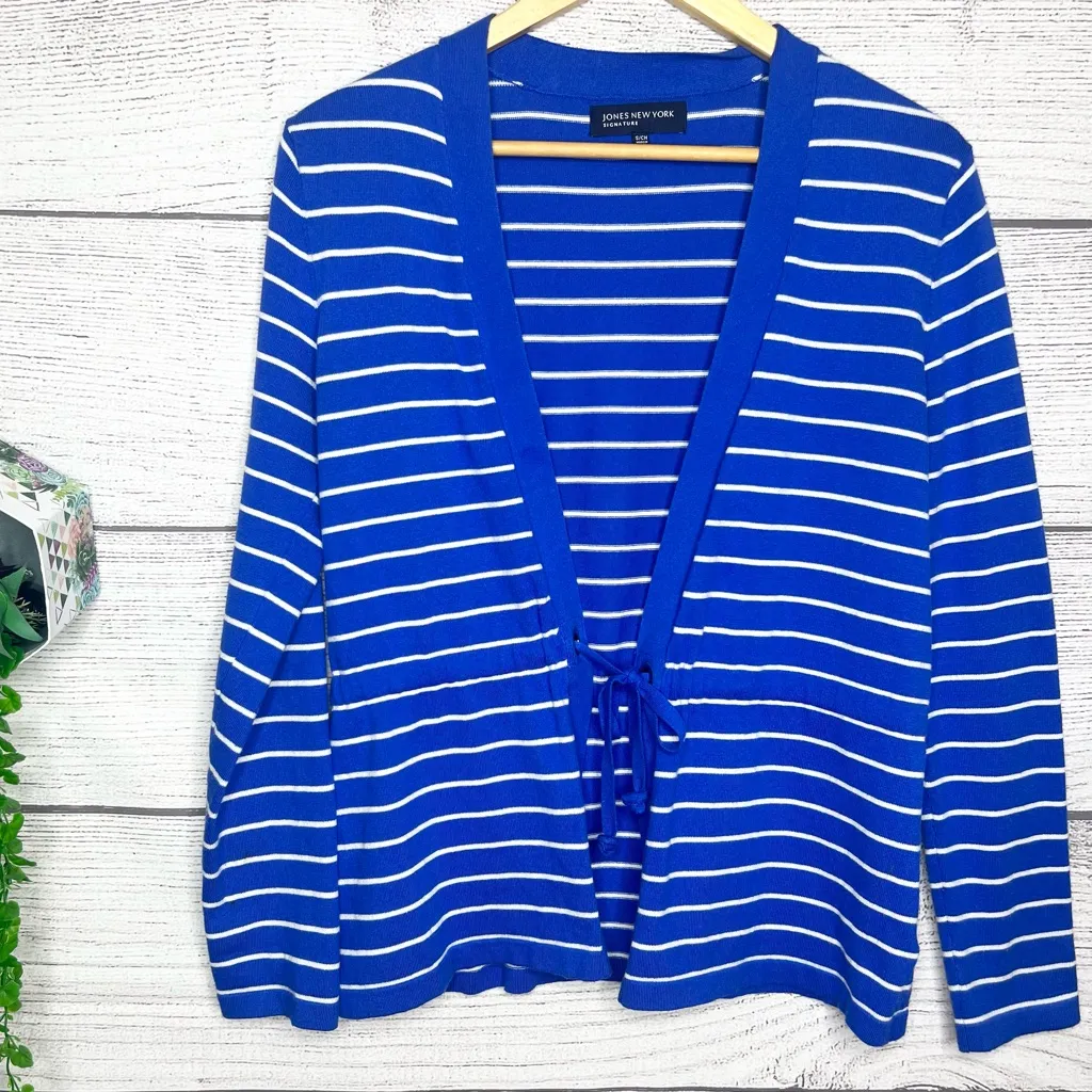 Jones New York Royal Blue & White Nautical Striped Tie Front Cardigan Women’s Size Small Approxim... Show more