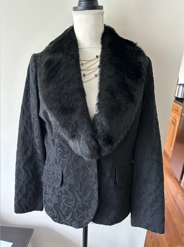 Jones New York Signature Black Jacquard Faux Fur Jacket Sz 8 NWT Removable collar One button blazer... Show more