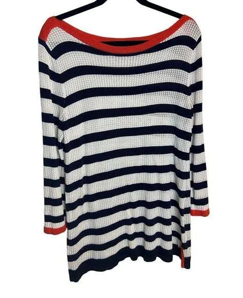 Excellent pre-loved condition of open knit cover-up sweater. Nautical blue and white stripe with ora... Show more