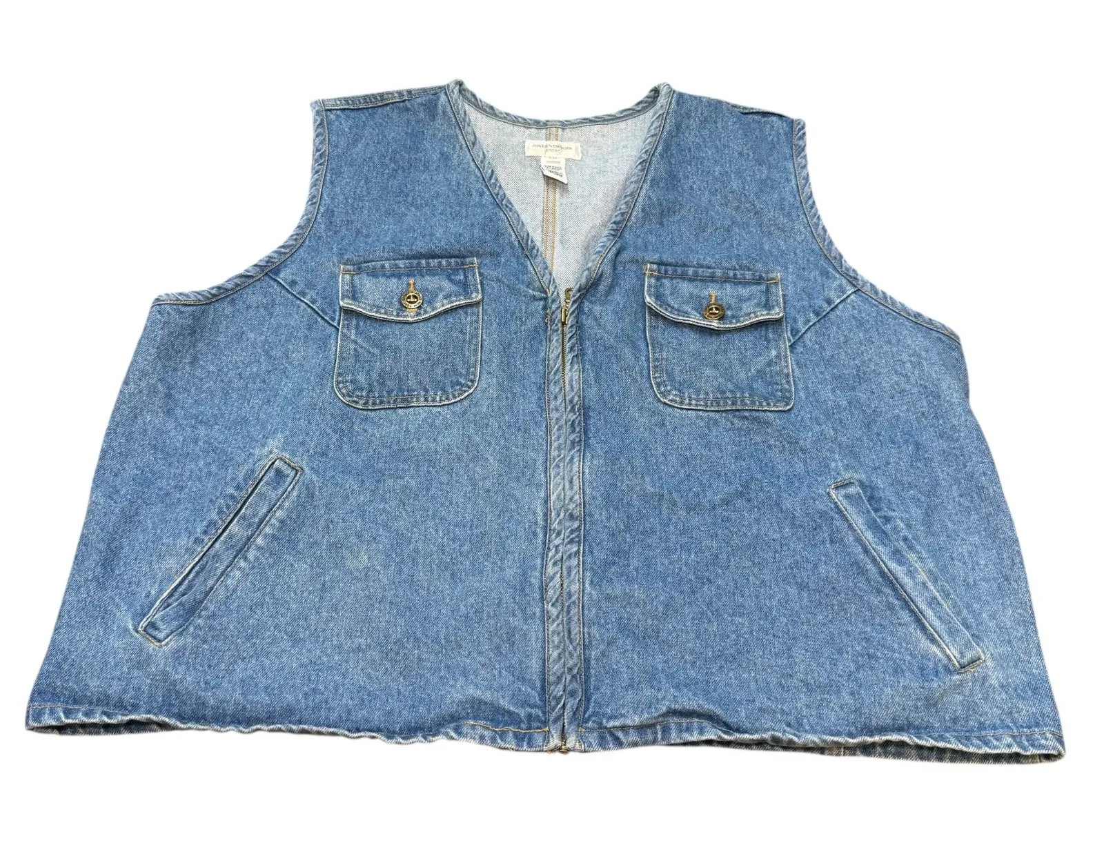 Denim daze! Introducing a classic denim vest, a stylish and versatile addition to any wardrobe. This vest features a full zip-up front for easy layering and a flattering V-neck design. Two functional chest pockets with stylish button closures add a touch of utility and visual interest, while discreet side pockets offer convenient storage. With its comfortable fit and timeless denim wash, it is the ideal blend of fashion and functionality. Throw it over a casual tee for a relaxed weekend look, or layer it under a jacket for added warmth and style during cooler evenings. Pair it with jeans and boots for a classic Americana vibe. Type: Vest Outer Shell Material: 100% Cotton Style: Basic Jacket Department: Women Color: Blue Lining Material: Cotton Fabric Type: Denim Features: Full Zip, Zipped Pockets, Oversized, Lightweight, Inner Pockets Accents: Button, Zipper Pattern: Solid Season: Fall, Spring, Summer Closure: Zip Occasion: Casual Keywords: denim vest, sleeveless jacket, plus size vest, womens vest, zip front vest, cotton vest, jones new york vest, casual vest, vintage vest, classic denim, 2X vest, blue denim vest, oversized vest, denim outerwear