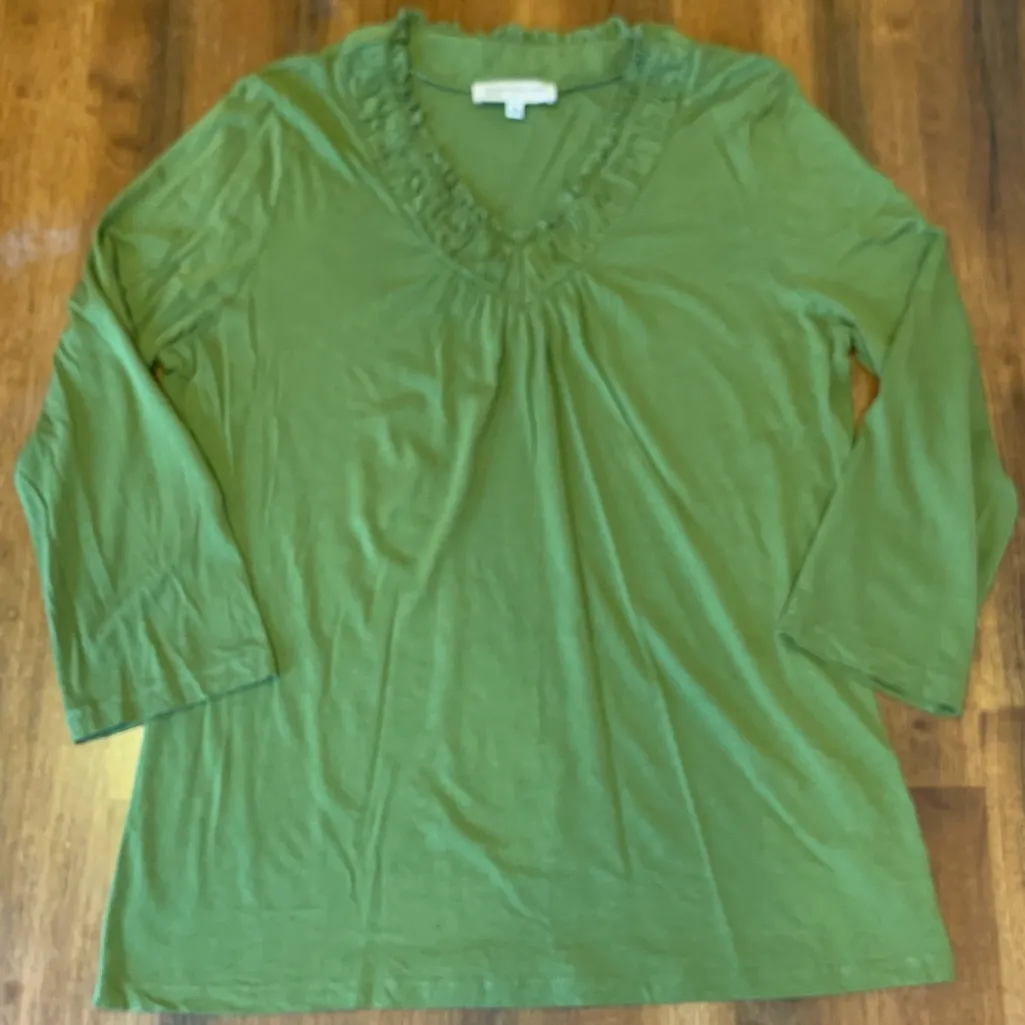 Bin 114 Elegant olive top with pleated ruffle V-neck. Ideal for versatile wear. Casula Everyday wear
