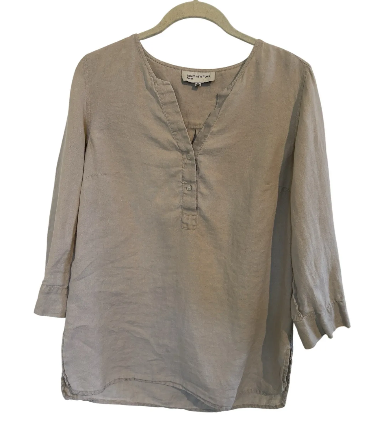 Jones New York Sport 100% Linen Half button up High Low hem cut Size Medium Front Length 26” E... Show more