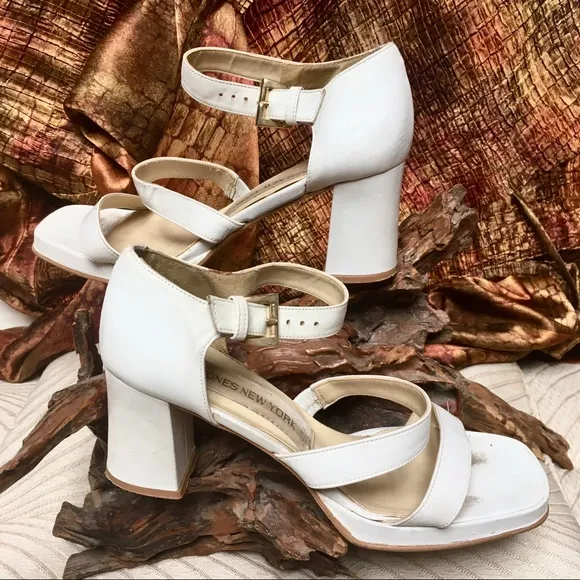 Vintage 90s Y2K white strappy sandals. Chunky leather-wrapped 2.5” block heels, small .5" platform,... Show more