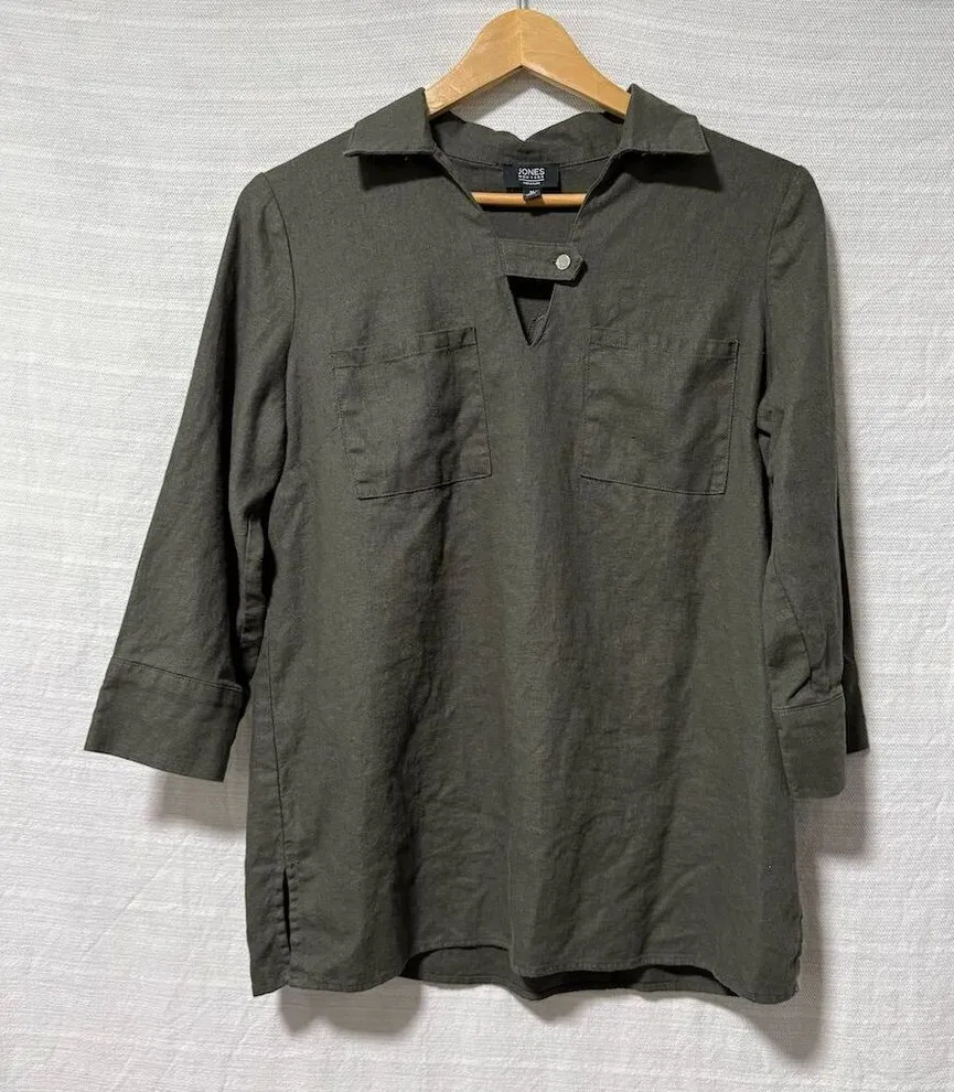 This Jones New York shirt is designed for women and comes in a regular size medium. The top is made... Show more