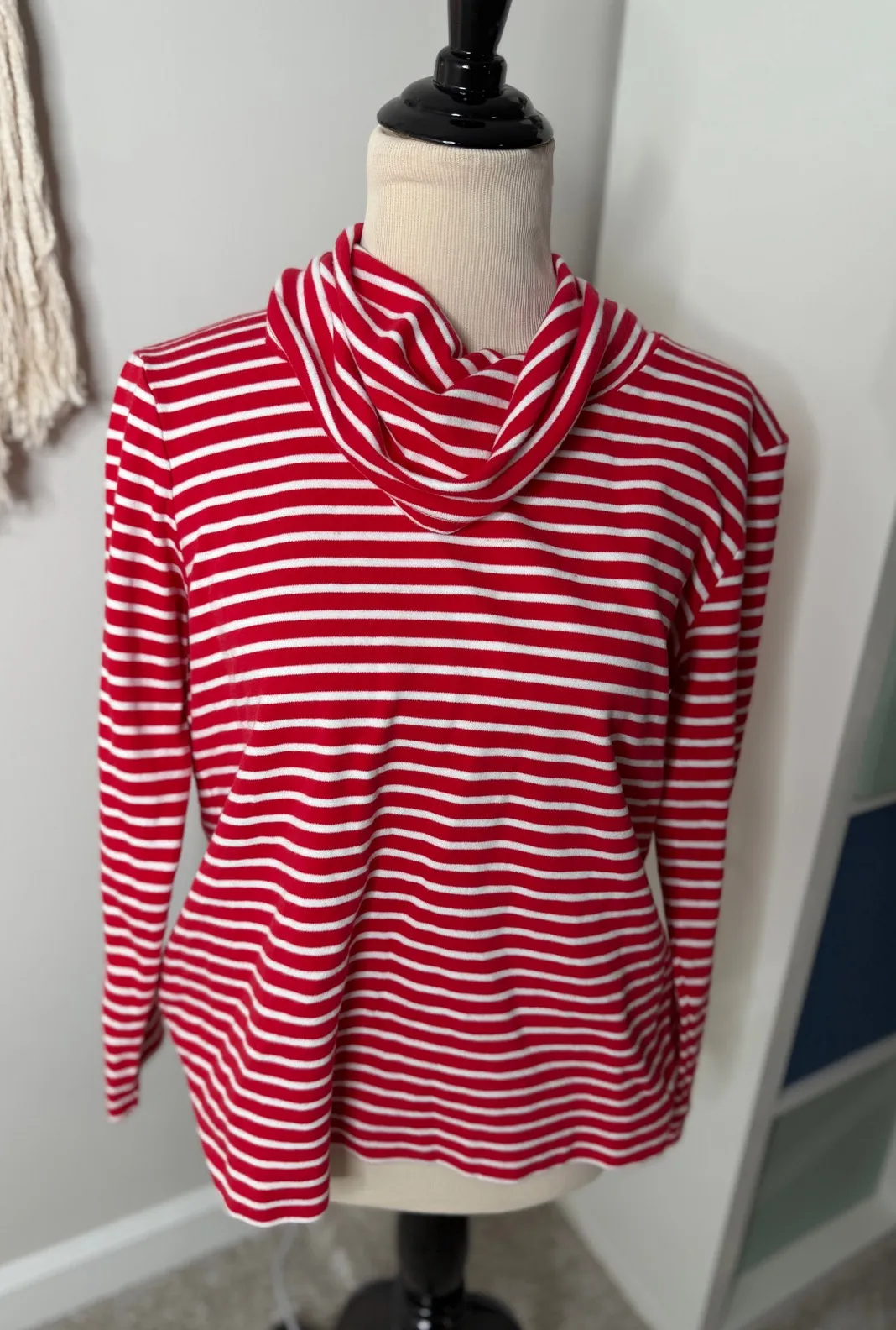 Jones New York Women's Red White Stripe Mock Cowl Neck Turtleneck 100% Cotton Long-sleeved Shirt Top... Show more