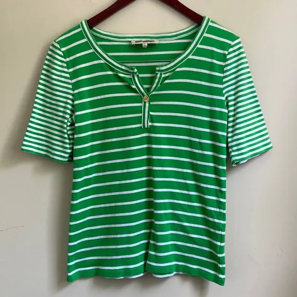 Jones New York women’s short sleeve top Size Large Beautiful green and white stripes Excellent preow... Show more