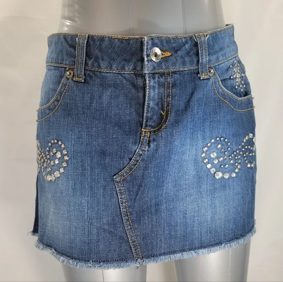 Like new, stylish Jordache blue denim mini skirt, features rhinestone accents and a frayed hem for a trendy look. Perfect for casual outings. Measurements are approximately 15.5" waist and 12" hem.