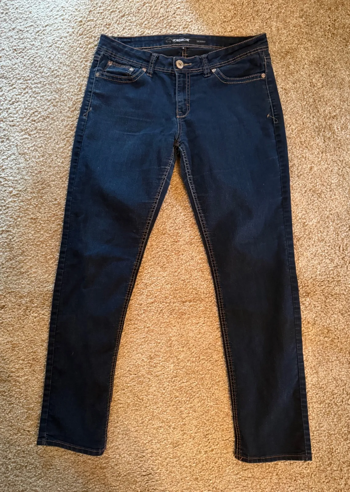 Classic denim jeans with a modern twist, featuring a sleek, skinny silhouette, making them a versatile addition to any wardrobe. These jeans are designed with a comfortable mid-rise waist and a flattering fit through the hips and thighs, complemented by a dark wash. The back pockets are embellished with a subtle stitch pattern. These jeans are perfect for everyday casual wear, weekend outings, or dressed up with heels for a night out. Jordache Skinny Size 8 Pre- Owned in good condition Does show wear in between legs Keywords: Jordache, skinny jeans, dark wash jeans, womens jeans, denim, casual jeans, slim fit jeans, everyday jeans, designer jeans, stylish jeans