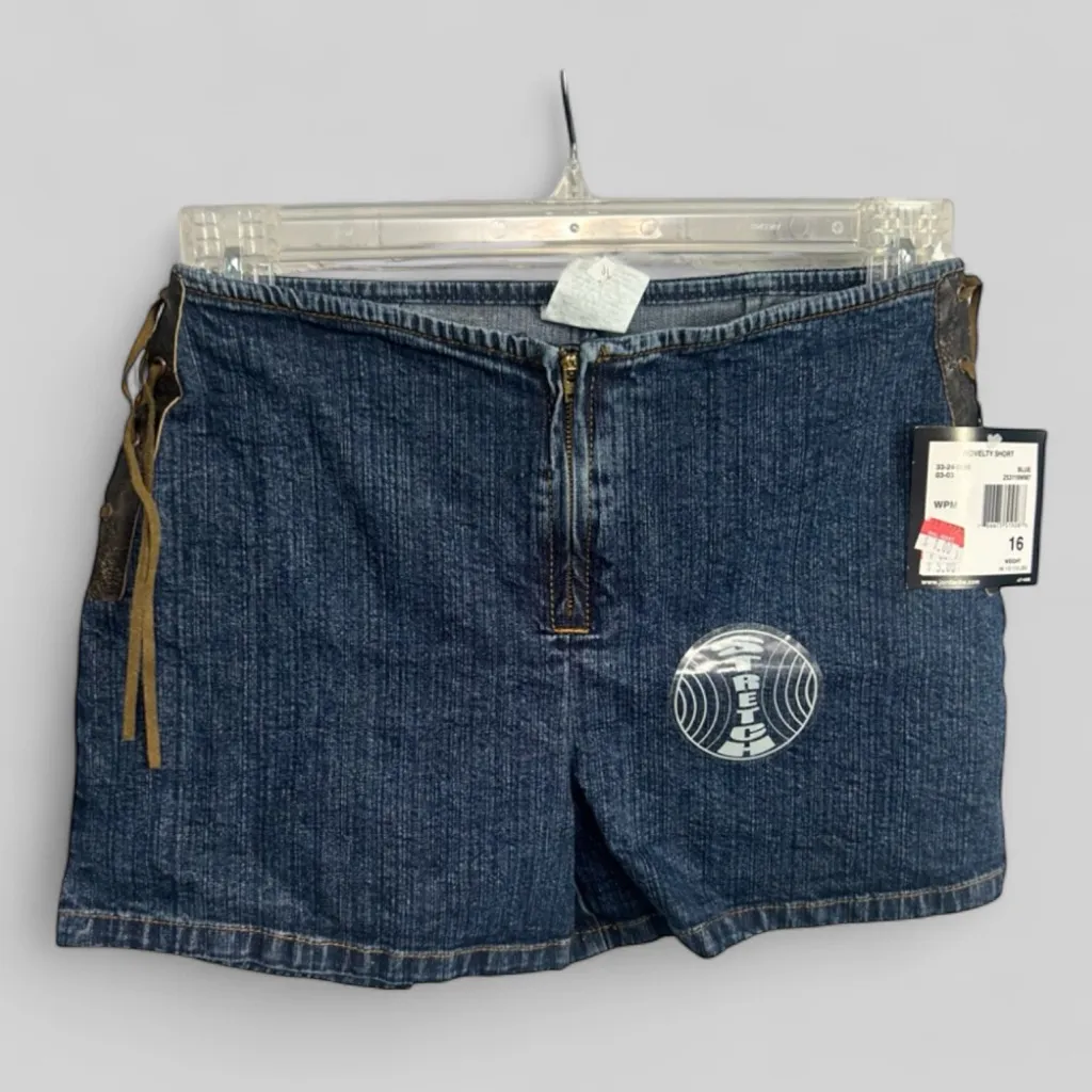 new with tags denim shorts retro vintage deadstock from 80s/90s made in Egypt cotton 14" across the waist 14" length 4" inseam faux leather fringe accents tooled western unique statement hippie festival boho vibes grannycore these are vintage and run small, see measurements ****