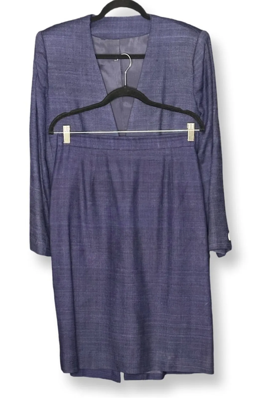 100% silk navy blue skirt and blazer suit set from the 80’s. Unbranded in size 14, blazer with pockets and knee length skirt that zips up the back. • vintage 80’s • JOs. A Bank • Sz 14 (fits more like a 10. See measurements below) • 100% silk • navy blue • skirt & blazer Condition: 8/10 vintage excellent. no damages just light signs of wear. *raw silk will show some “flaws” in the stitching (see photo) Measurements (approximately) blazer: - shoulders 16” - p2p 19” - length 28” - sleeves 23” skirt: - waist 15” - length 24”