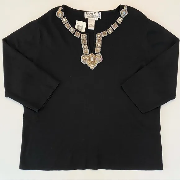 Brand new, beautiful embellished knit sweater with beading and jeweled neckline. Size 2X XXL Condition-No flaws Viscose and Nylon fabric. Style tags-Santana, St. Johns, cocktail, embellished, jeweled, jewel, capsule, 3/4 sleeve, elbow sleeve, brunch, party, plus, solid, sweater, v-neck, versatile