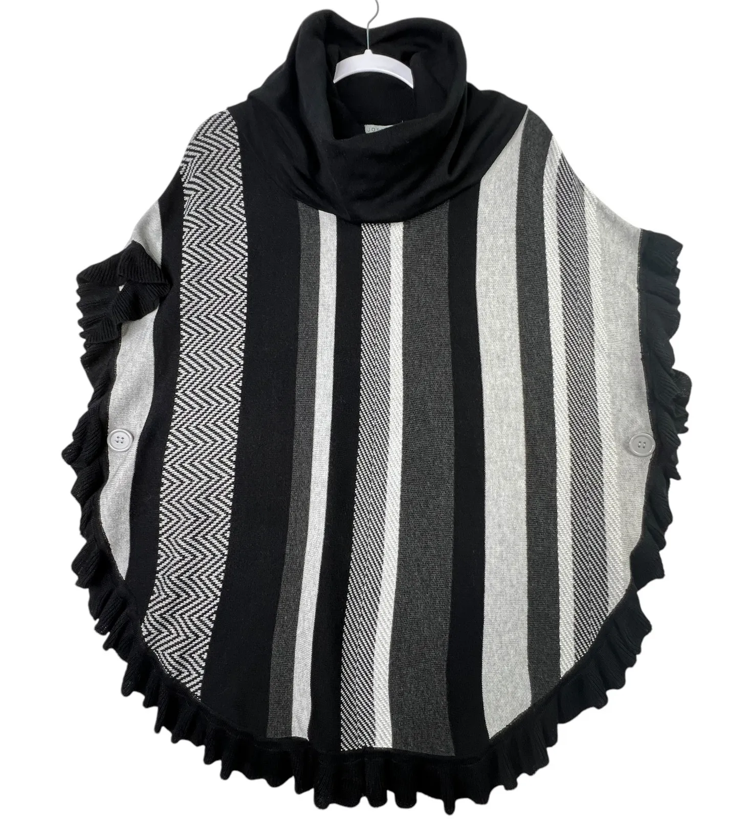 Brand: Joseph A. Chic, cozy, and unique, the perfect statement poncho for effortless cold-weather style. Features: • Cowl neckline • Sleeveless knit design • Black/gray/cream vertical stripe pattern • Ribbed ruffle hem trim • Stretch knit • Extra button included • Size: M • Material: 100% rayon • Color: Black/Gray/Cream Item Condition: Pre-owned, excellent Measurements: Length approx. 31.5” (shown in photos) quiet luxury, modern minimal, soft classic, winter chic, layered neutral, cozy, contemporary knit, casual Neutral • Streamlined • Structured • Monochrome • Sleek • Refined • Essential • Modernist • Crisp• Minimalist • Preppy • Dark Academia ⭐️ 5 Star Seller 📦 Bundle Discounts Available 📫 Shipping Next Business Day