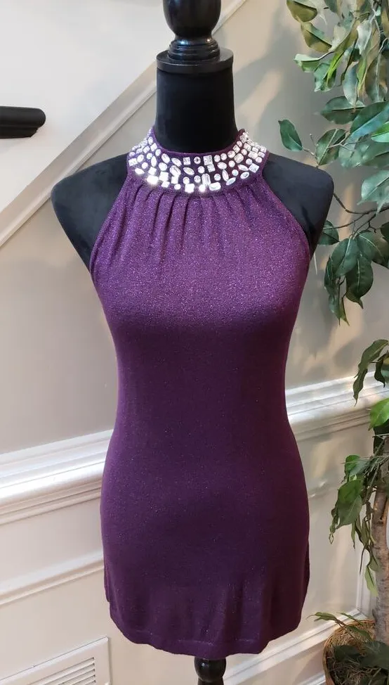 Brand: Joseph A. Type: Top Color: Purple Turn heads at your next event with this Joseph A. purple halter top, size Large. The top features a stunning jewel-encrusted neckline that adds sparkle and glamour, while the form-fitting bodycon design offers a sleek and stylish silhouette. Crafted from a soft, sparkling knit fabric, this top is perfect for evening occasions, cocktails, or any night out, with a subtle back keyhole closure.