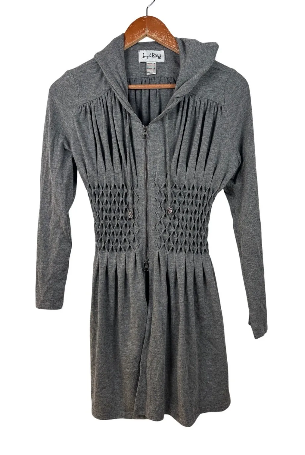 Stylish gray Sweater/ cardigan by Joseph Ribkoff in the size US 8. This long-sleeve sweater/ cardigan dress features a comfortable hood and a unique smocked diamond-patterned detail at the waist. The design includes flattering ruching and a full zipper, combining comfort and style. It can be worn as a dress or as a jacket. It is in excellent preowned condition with no flaws to note. Approximate lay flat measurements: Length: 31" Pit to pit: 18" Keywords: Joseph Ribkoff dress, gray hooded dress, long sleeve dress, diamond detail dress, casual dress, womens dress, designer dress, zipper dress, ruched dress, comfortable dress, classic dress, modern dress, day dress, jacket dress, gray, minimalist, neutral *From a smoke free home *Ships next business day