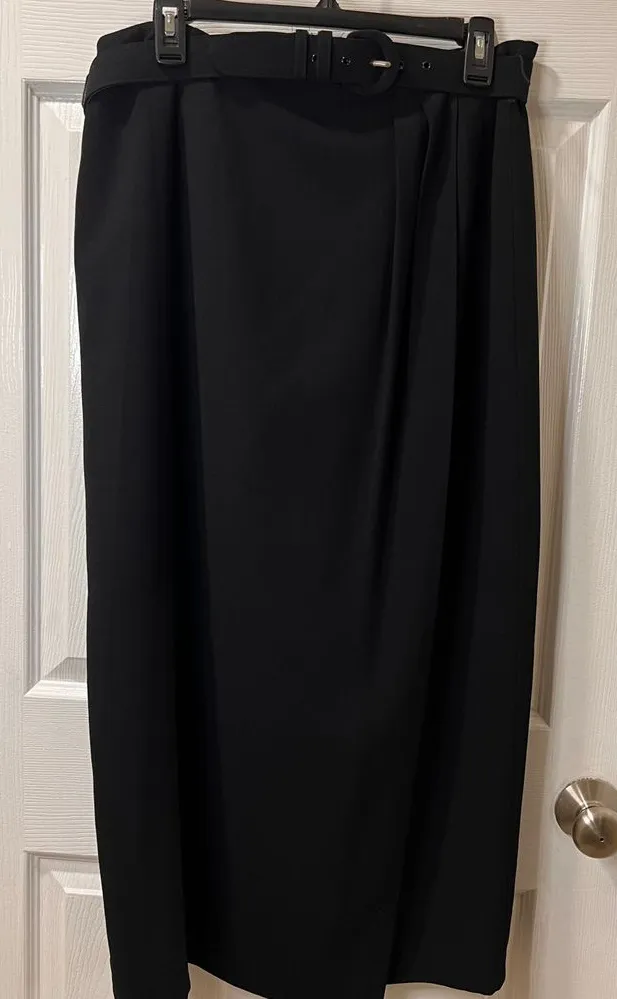 Chaus Vintage sleek black maxi skirt perfect for formal occasions. Features a stylish belt with silver-toned hardware. Made from a flowy, high-quality fabric that drapes beautifully. Ideal for evening events, work functions, or upscale dinners. The versatile design allows for easy pairing with various tops for a polished look. Type: Skirt Style: Maxi Skirt Length: Long Color: Black Department: Women Material: Polyester Pattern: Solid Accents: Belt Fabric Type: Knit Features: Elastic Waist, Lined, Stretch Closure: Buckle Rise: High Occasion: Formal, Business, Party/Cocktail The belt loop on the left side is not in tack. Keywords: black skirt, maxi skirt, formal wear, belted skirt, long skirt, women's skirt, evening wear, flowy skirt, elegant skirt, versatile skirt