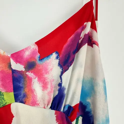 Swingy ruffle tiers accentuate the whimsical silhouette of this vibrant floral-print maxi dress from Josie by Natori. Features a low crisscross strap back. Red floral printed crepe (100% Polyester). Maxi. Sleeveless. V-neckline. Fully lined. Has a very faint spot on the front, as pictured, I have not tried to stain treat but very possible that it would come out. Otherwise, minimal signs of wear.
