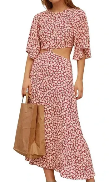 All orders ship next business day! New With Tags Joteisy Sexy Cut Out Dress, round neckline, big swing short sleeves, center back keyhole with button, open lower back and waist cutouts, elastic back hem with zipper, soft fabric, comfortable wear, women's size XL. Condition: new, excellent condition Size: XL, length- 54", pit to pit- 20" (measurements are approximate) Color: red, white summer, spring, vacation, cute, floral, flowers, fun, sexy, cut-out, maxi, midi, fun, party, wedding, event, cocktail, dinner, casual, women, women's Smoke free and pet free home!