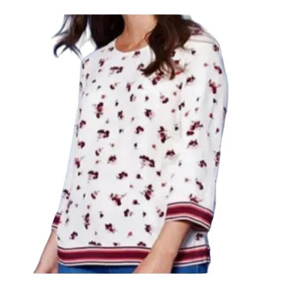 Joules Pullover Blouse Size: Women’s 12 Pit to pit: 22” Length: 27” Color: Ivory/Purple/Pink Material: Viscose Pullover style 3/4 sleeve Floral print with constracting stripes Round. In good condition used condition. No noticeable holes or stains.