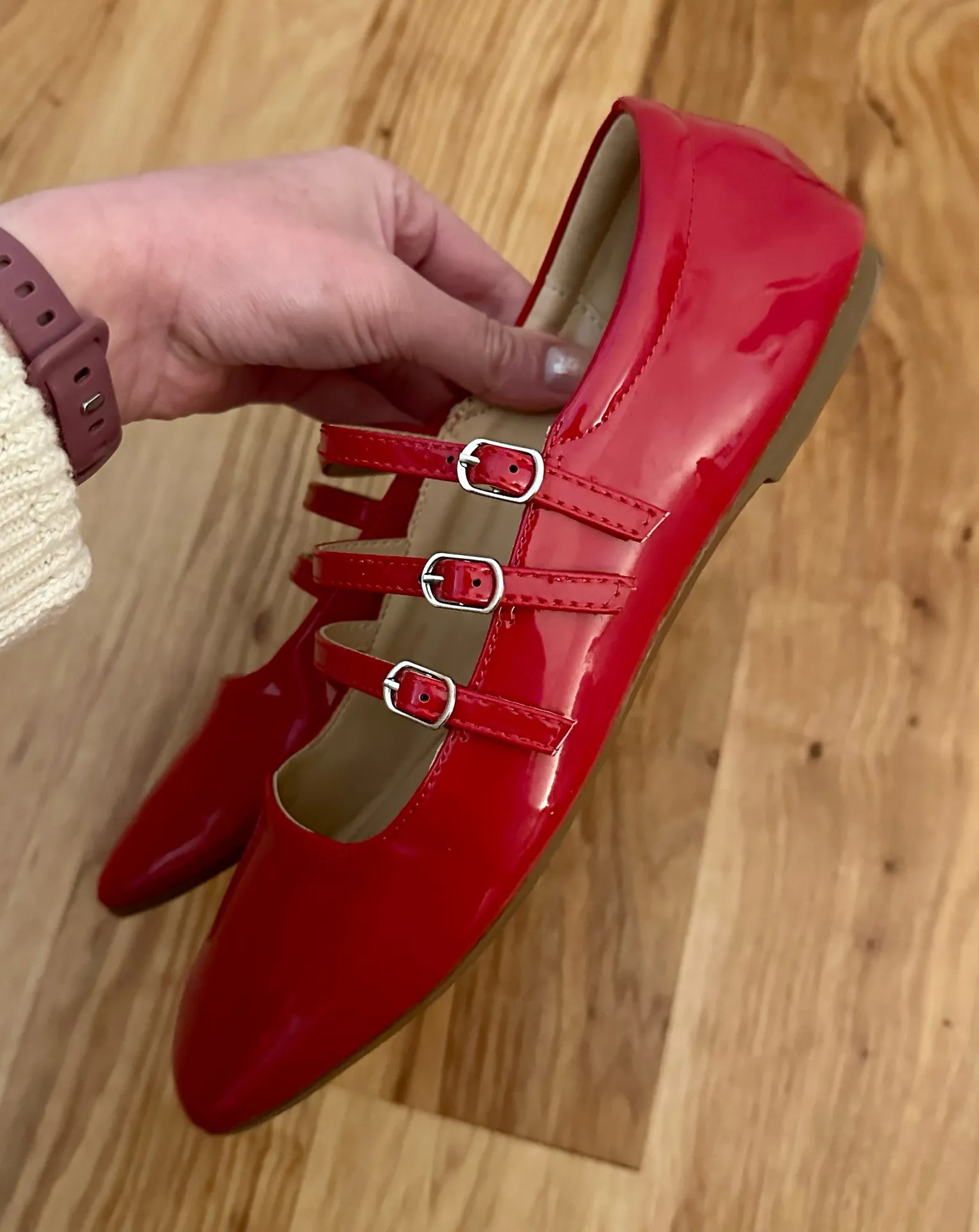 Journee Collection “Darlin Mary Jane” patent faux leather cherry red ballet flats. Square toe with triple adjustable buckle straps. Size 8. Very cushioned sole. Worn once - excellent condition.