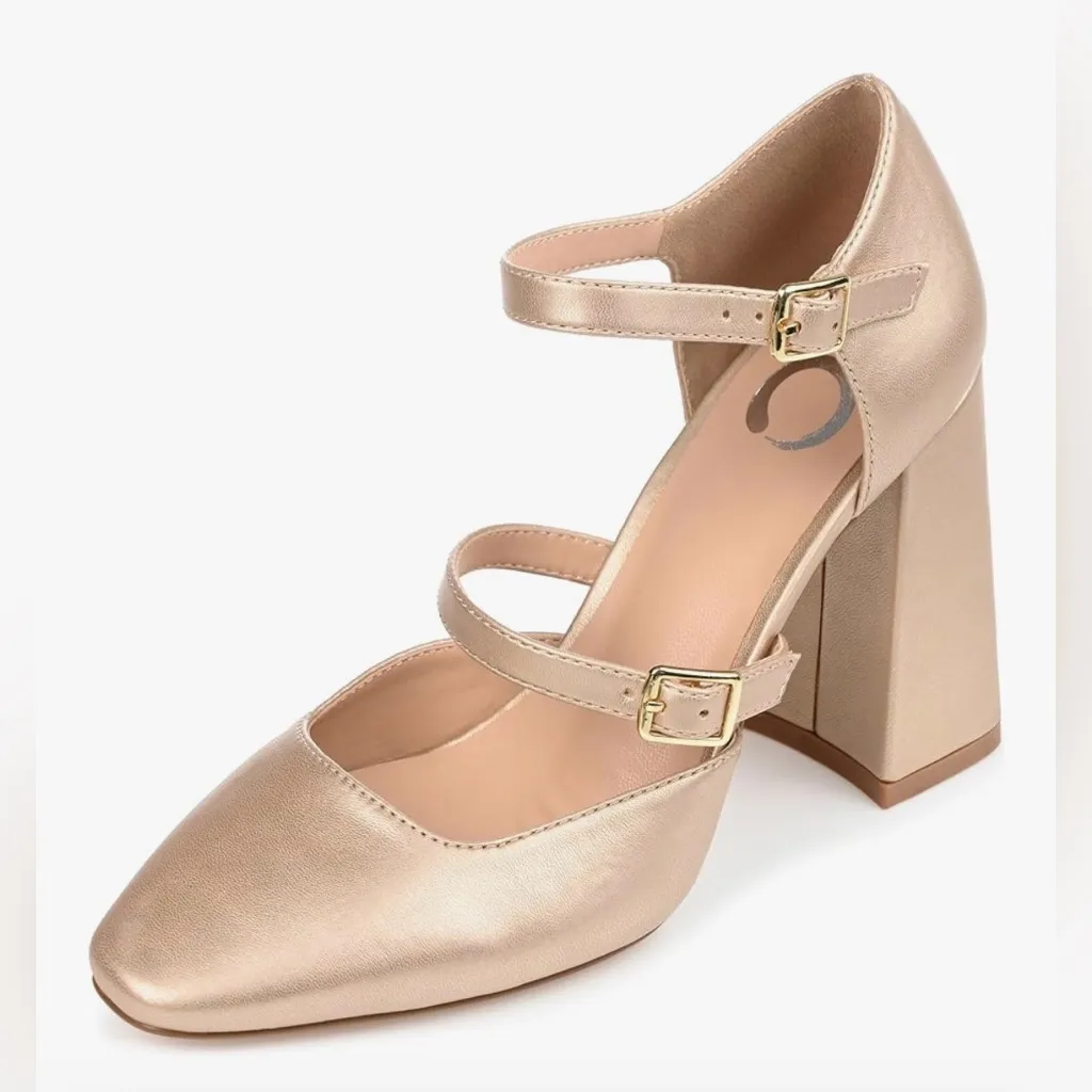 Champagne gold NO BOX -THERE IS A Small Indentation ON THE BACK HEEL AREA AS SHOWN in one of the photos Origin Imported Sole material Polyurethane Outer material Polyurethane (PU) Closure type Buckle About this item Heel Height: 3 1/2-inch. Heel Type: Block Heel. Platform Height: Flat-inch. Shoe Width: Medium. Closure Type: Buckle. Strap Type: Multi -Strap. Toe Style: Square. Lining: Faux Leather. Upper Material: Man-made. Outersole Material: Man-made. Footbed: Padded. All measurements are approximate and were taken using a size 6. Please note measurements may vary slightly by size. Description Add a vintage vibe to your shoe collection with the Isadorah pump by Journee Collection. This modern take on the Mary Jane heel is rendered with vegan leather uppers topped with twin buckle straps. A retro square-toe and covered block heel finish this midcentury look.