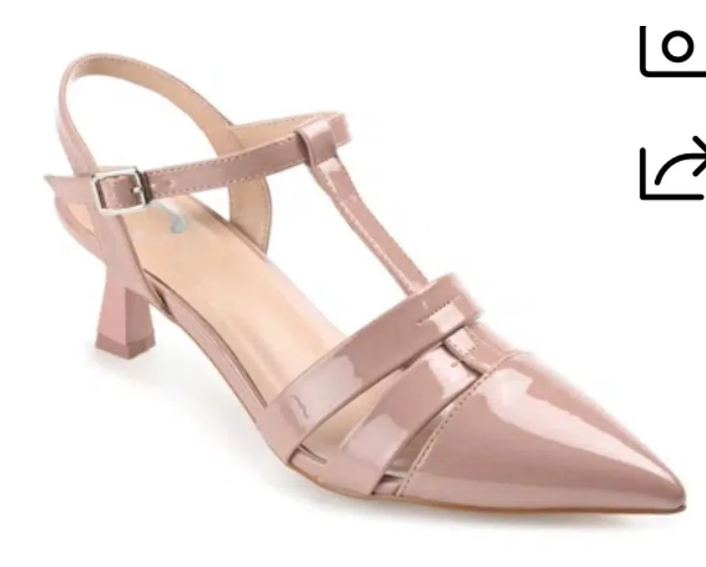 NO BOX Blush Add a beautiful addition to your closet with the Goldie kitten heel by Journee Collection. This adorable heel features a soft faux suede material with a cut-out design on the heel. The pointed toe shape and the angled design at the toe complete this look. At Journee Collection our pump styles will let you go from a fun night out with the girls to kicking back and relaxing at the end of the night without any trouble. Upper Material: Faux Suede • Toe Style: Pointed • Heel Height/Type: 1 1/2-in Kitten Heel • Closure Type: Slip-on • Shoe Width: Medium
