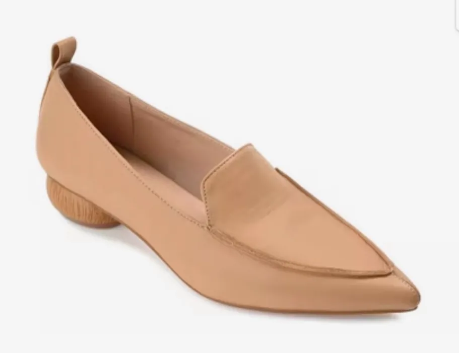 NO BOX Make everyone take notice of your flawless fashion sense with the Journee Collection Maggs loafer. This slip-on flat flaunts a sleek pointed silhouette with twin notches and faux wood oval block heel to make a style statement that deserves praises. Item # 544109 UPC # 194593911727 FEATURES Vegan synthetic upper Slip-on Pointed toe Synthetic lining Padded footbed 1.25" block heel Synthetic sole Imported