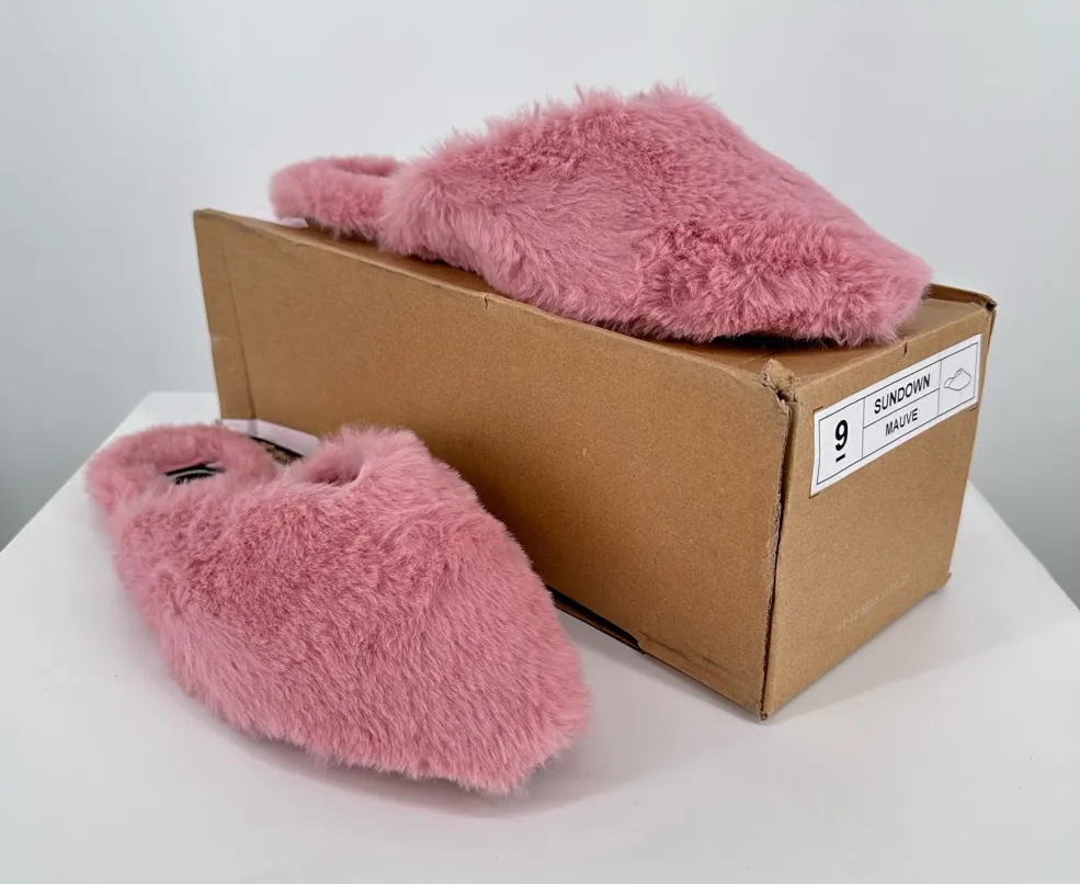 Add some luxury to your wardrobe with this plush fur slipper from Journee. Sink into this almond-toe mule, kick back and relax. • Almond-Toe • Backless Slipper • Cushioned Insole • Flat Sole • Plush Faux Fur No flaws, these were briefly tried on, never worn. Color is truest in the first couple of pictures.