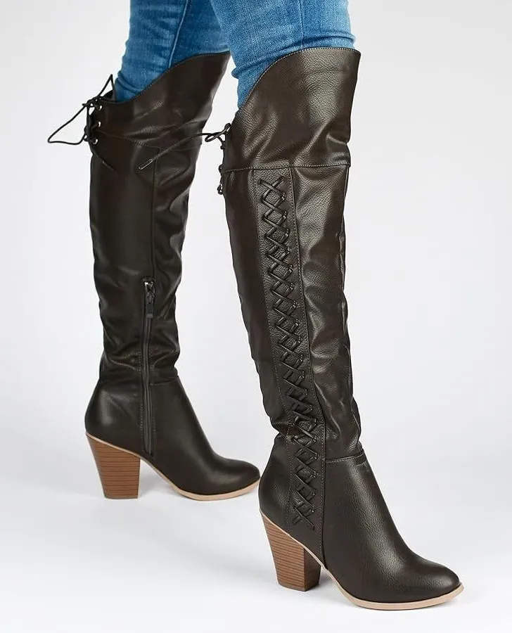 Reboot your fall wardrobe with the Women's Journee Collection Spritz Over the Knee Block Heel Boot. Vegan leather upper in an over the knee block heel boot style with a round toe Inside zipper entry Crisscross back tie detail Over the knee 22" shaft height 14.5" calf circumference Padded footbed Block heel 3.5" heel height Model boots may differ in color. New in box never worn. Olive green women boots with side zipper. Please refer to photos for all details. Ask any questions. Smoke free home. Fast shipping.