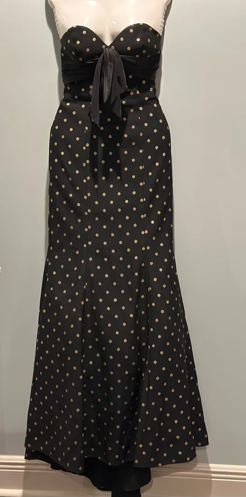 Jovanni Black with shimmering gold polka dots Strapless sweetheart neckline Bow accent Fitted bodi... Show more