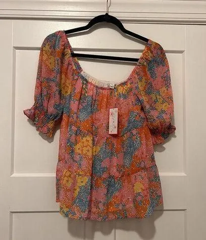 Adorable lightweight floral top with elastic cap puff sleeves. Loose flirty feminine fit. Can be worn off or on the shoulders. Great little top for going out, brunch, vacation, teachers or office work wear.