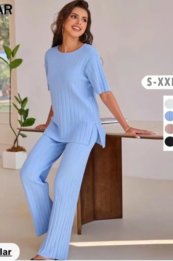 Effortless chic emanates from this JOYFUNEAR ribbed knit two-piece set. The relaxed fit t-shirt top features short sleeves and elegant side slits, offering a flattering silhouette. Complementing the top, the wide-leg pants boast a comfortable, stretchy waistband and a full, flowing drape. This versatile ensemble transitions seamlessly from casual lounging at home to stylish errands or a relaxed brunch. Perfect for cozy evenings in or chic daytime outings. Department: Women Type: Outfit/Set Style: Tracksuit Fabric Type: Jersey Set Includes: Pants, Casual Shirt Performance/Activity: Yoga Number of Pieces: 2 Piece Material: Acrylic Blend Pattern: Striped Occasion: Casual Features: Slit, Stretch Sleeve Length: Short Sleeve Fit: Relaxed Closure: Pullover Keywords: loungewear, knit set, two piece outfit, casual wear, athleisure, wide leg pants, short sleeve top, comfortable, stylish, versatile, light blue, ribbed texture Box T