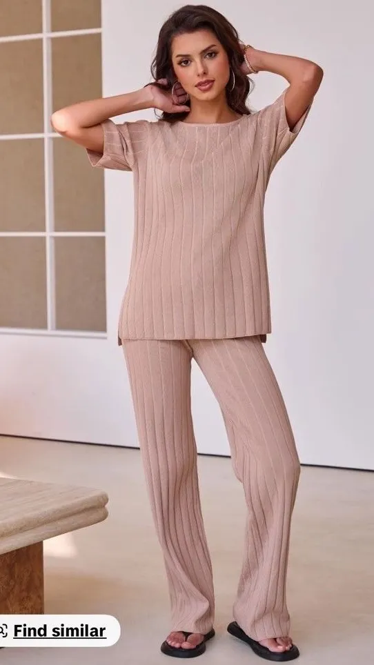 Effortless chic emanates from this JOYFUNEAR ribbed knit two-piece set. The relaxed fit t-shirt top features short sleeves and elegant side slits, offering a flattering silhouette. Complementing the top, the wide-leg pants boast a comfortable, stretchy waistband and a full, flowing drape. This versatile ensemble transitions seamlessly from casual lounging at home to stylish errands or a relaxed brunch. Perfect for cozy evenings in or chic daytime outings. 2 pue Department: Women Type: Outfit/Set Style: Tracksuit Fabric Type: Jersey Set Includes: Pants, Casual Shirt Performance/Activity: Yoga Number of Pieces: 2 Piece Material: Acrylic Blend Pattern: Striped Occasion: Casual Features: Slit, Stretch Sleeve Length: Short Sleeve Fit: Relaxed Closure: Pullover Keywords: loungewear, knit set, two piece outfit, casual wear, athleisure, wide leg pants, short sleeve top, comfortable, stylish, versatile, light blue, ribbed texture Box T. Two piece set available in two colors both same size!