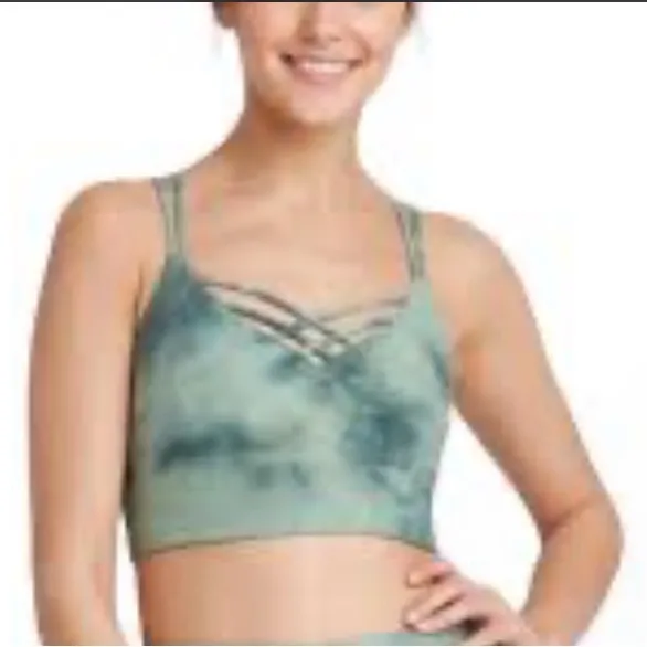 Here is a JoyLab tie-dye crisscross-back sports bra. The unique green watercolor-like pattern and the multi-strap design are distinctive features of this style. This sports bra features a V-neckline in the front and an open, multi-strap, crisscross design on the back for both style and support. This type of bra offers medium support, suitable for activities like yoga, running, or general workouts. It does not include the padding inside the bra. INDY F