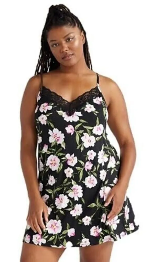 Elevate your wardrobe with this stunning Joyspun women's chemise. The black knit fabric is adorned with beautiful pink flowers, adding a touch of femininity to any outfit. The lace trim detailing enhances the intricate design and adds a unique touch to the piece. This plus-size top is perfect for any occasion and is a must-have for any woman's closet. The flowy fabric and comfortable fit make it a great choice for any day. Add this charming piece to your collection today!