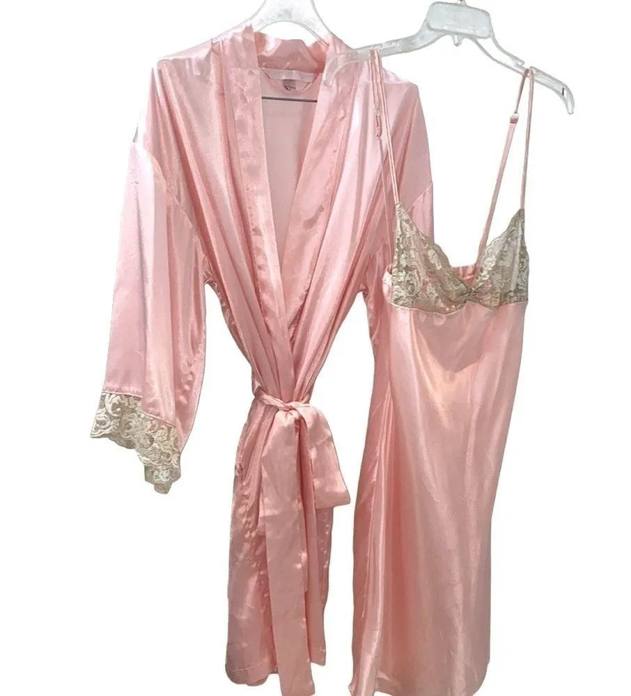Stunning Victoria’s Secret pink satin robe and chemise with beige lace. Pink label. Robe is wrap sty... Show more