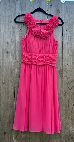 Pink Barbie ruffled formal dress size 4. Preowned great condition, one or two of the rhinestones are loose. Has zipper down back. The ruffles are cute flowers, color is stunning in person. 17 in pit to pit, 39 in top to bottom. 100% polyester. Ships in 2-4 days š