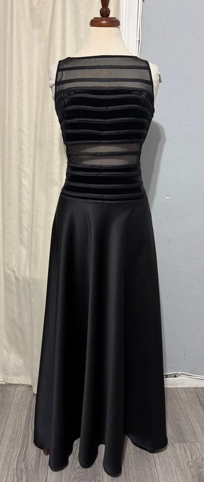 Preowned - Good condition A striking black formal gown from JS Collections, showcasing a sophisticated blend of textures. The sleeveless bodice features elegant horizontal sheer stripes interspersed with velvet bands, creating a captivating visual effect. This design transitions into a flowing, full-length satin skirt that drapes beautifully. Perfect for galas, weddings, or elegant evening events. Measurements: • Bust: 17 in • Waist: 15 in Style: Maxi Dress Length: Long Department: Women Sleeve Length: Sleeveless Pattern: Solid Occasion: Party/Cocktail, Formal Material: Polyester, Spandex Fabric Type: Velvet Theme: Bohemian, Designer Neckline: Round Neck Season: Fall, Winter, Spring, Summer Sleeve Type: Strapless Closure: Zip Accents: Layered Keywords: Goth, whimsigoth, Wedding, evening gown, cocktail dress, formal wear, velvet, satin, sheer, stripe detail, sleeveless, long dress, elegant, sophisticated, special occasion, party dress
