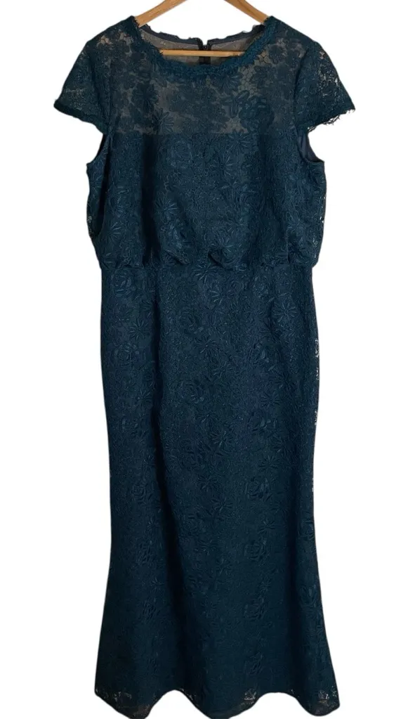 Chic lace dress in teal. Features short sleeves and elegant detailing. Perfect for special occasions. 20.5" across the front (pit to pit) 17" waist 61" length Dry clean only event statement old money preppy red carpet formal gala evening wedding mother of bride mother of groom opera