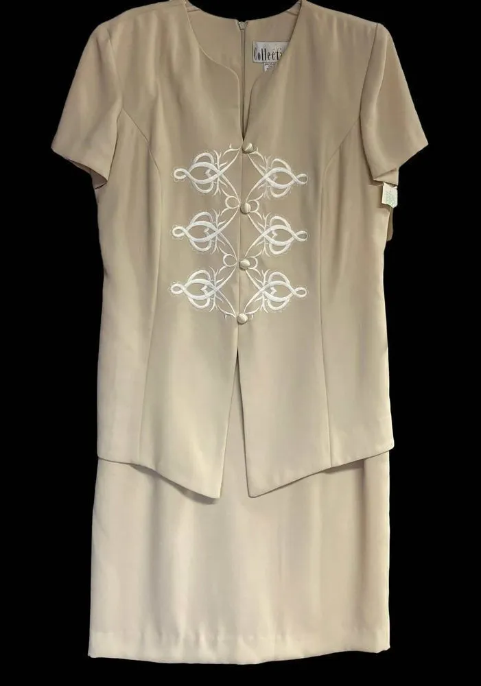 BRAND: JS Collections SIZE: 14 COLOR: Beige MEASUREMENTS: See pictures MATERIAL: 100% Polyester OTHER DETAILS: Please see approximate measurements in pictures before purchasing. Use your own judgment as to the fit. Shoulder Pads 40” Length Short sleeves Dry clean One Piece Vintage vibes Retro Back zipper